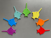 Das "Sägebogen" -Set beinhaltet 7 gleich große Pieksis (🐟 Sägefisch) in den leuchtenden Farben des Regenbogens: Hell-Lila, Blau, Türkis, Grün, Gelb, Orange und Rot.