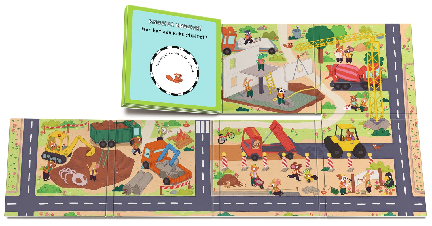 Der Spielteppich, der immer mit dabei ist: Das Leporello-Pappbilderbuch verwandelt sich ruckzuck in eine riesengroße Wimmelszene voller Baustellen, Bagger, Autos und natürlich Straßen. So ist der Untergrund für die allerliebsten Spielzeugautos und Bagger immer griffbereit und genauso schnell wieder aufgeräumt. Kleine Suchaufgaben ergänzen die Wimmelszene: Findest du den Hammer? Und was passiert wohl auf dem Dixiklo…? Und mit Anlegen des zweiten Bandes der Reihe lässt sich die Straßenszene nahtlos rund ums Thema Stadt verdoppeln.
