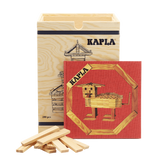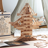 Der Kasten enthält 280 identische, naturbelassene KAPLA-Holzplättchen, die nur den eigenen Ideen folgend, ohne jede Befestigung, aufeinandergestapelt werden.