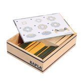 Der Holzkasten enthält einen Bausatz aus 75 naturfarbenen und farbigen Holzplättchen (55x naturfarben, 10x gelb und 10x grün), mit dem schon Kinder ab 2 Jahren Freude haben werden.