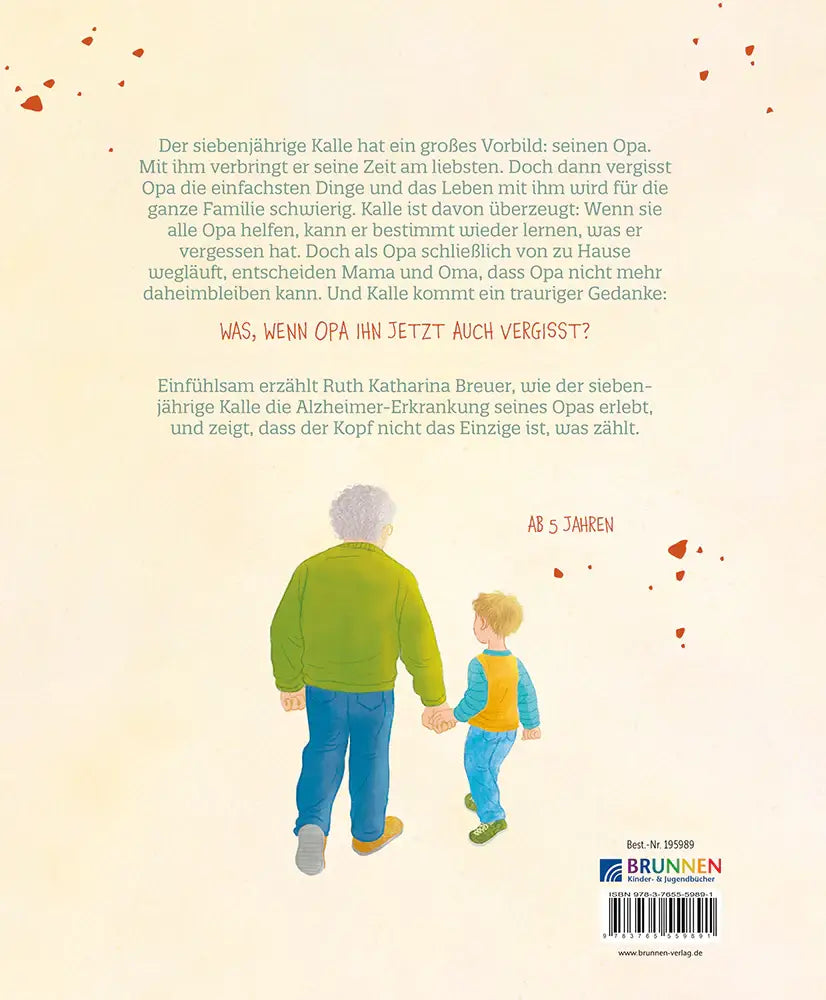 Ich hatte das Glück, dass ich über die Kinderbuchmanufaktur die Chance bekommen habe, meine Geschichte beim BRUNNEN Verlag zu pitchen. Die Zusammenarbeit war von Anfang an von großer Wertschätzung meiner Person als Autorin gegenüber geprägt, obwohl ich selbst in diese Rolle erst einmal hineinwachsen musste. Ich konnte während des gesamten Entstehungsprozesses meine eigenen Vorstellungen einbringen und durfte letztlich sogar die Illustratorin mitaussuchen. Der warme Stil von Paran Kim war für mich absolut passend für das Thema. Und sogar meiner Bitte, den Opa in dem Buch auch optisch an meinen Vater anzulehnen, wurde entsprochen. Die Vignette auf der (Innen-)Titelseite basiert auf einem echten Foto.