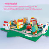 Dank seiner leichten und kompakten Form ist das Playset "Meine Stadt" der perfekte Begleiter für Reisen, Ausflüge oder Restaurantbesuche. Es lässt sich einfach verstauen und sorgt überall für abwechslungsreichen Spielspaß.