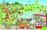 Rotraut Susanne Berners Wimmelbuch-Reigen geht weiter: Die ganze Stadt und ihre Umgebung stehen im Zeichen des Frühlings. Allmählich werden Bäume und Felder grün, die ersten Blumen blühen, an anderer Stelle wird gesät. Der Bauer hat alle Hände voll zu tun und Thomas plant eine Fahrradtour mit Lene. Im Streichelzoo dürfen die Tiere ihr Winterquartier verlassen und Manfred stolpert beim Joggen in die Arme von Susanne. Endlich ist der Rohbau des neuen Kindergartens fertig, so dass bald Richtfest gefeiert werden kann. Fröhlich kickt Ina ihren Ball über den Bürgersteig, was natürlich nicht ohne Folgen bleiben kann…