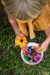 36 pilzförmige Teile in 12 Regenbogenfarben zum Erstellen von Mandalas und für jedes andere freie Spiel.