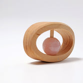 Rassel mit Rosenquarz-Perle. Diese Rassel spielt mit dem sinnlichen Kontrast zwischen warmem Holz und kaltem Halbedelstein.