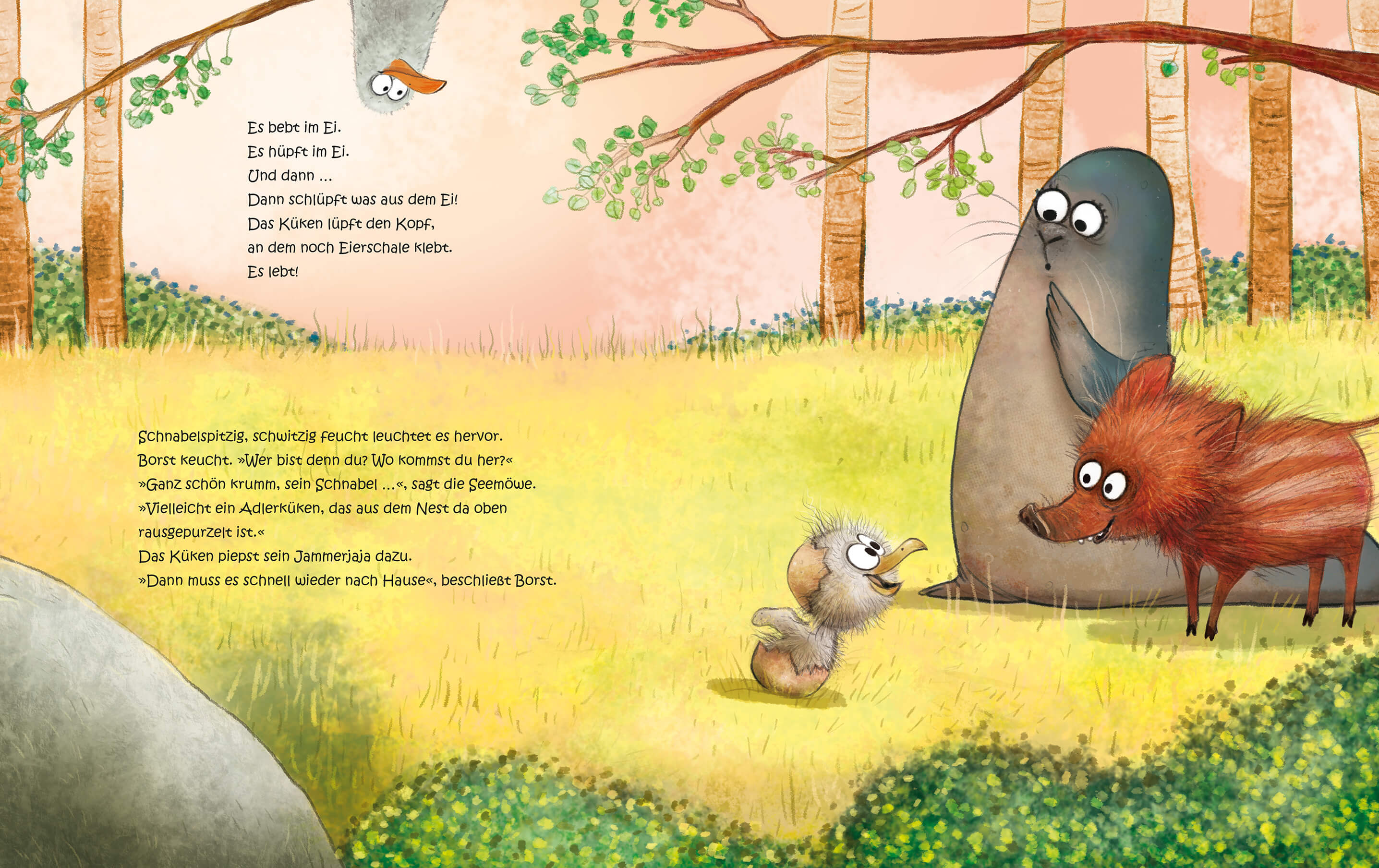 Borst, die Robbe Merilyn und die Seemöwe finden ein Ei. Doch wo kommt es her und wie kommt es dahin zurück? Und – huch! – was passiert denn da? Es bebt im Ei. Es hüpft im Ei. Und dann … Dann schlüpft was aus dem Ei! So macht sich Frischling Borst auf, das Küken sicher nach Hause zu bringen – und die Welt zum allerersten Mal von ganz hoch oben zu betrachten. Der langersehnte zweite Band von Borst vom Forst – ein neues witzig-poetisches Bilderbuch-Abenteuer, wieder genial illustriert von Wiebke Rauers!