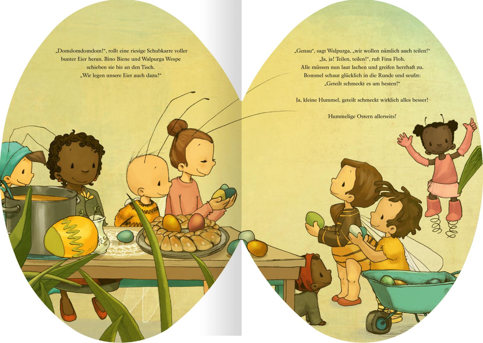 Die kleine Hummel Bommel und ihre Freunde wollen zusammen ein schönes Osterfest feiern. Sie freuen sich auf ein hummeliges Festessen mit Marie Marienkäfers köstlichem Honigbraten und natürlich ganz besonders auf die große Ostereiersuche. Als Pastor Fliege endlich den Startschuss abfeuert, gibt es so erst einmal ein wildes Durcheinander. Jeder will die schönsten Eier finden. Aber ist es wirklich das, was an Ostern zählt?