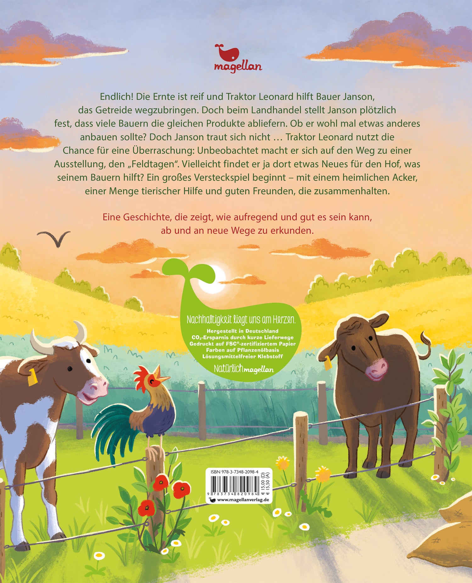 Endlich! Die Ernte ist reif und Traktor Leonard hilft Bauer Janson beim Wegbringen des Getreides. Doch beim Landhandel stellt Janson plötzlich fest, dass die anderen Bauern häufig dieselben Produkte abliefern. Traktor Leonard macht sich auf zu den „Feldtagen“ - vielleicht findet er ja dort etwas Neues für den Hof, was seinen Bauern überzeugt? Ein großes Versteckspiel beginnt – mit einem heimlichen Acker, einer Menge tierischer Hilfe und tollen Freunden, die zusammenhalten. Nach dem Erfolg von „Leonard – Ein Traktor sucht das Abenteuer“ folgt nun das nächste spannende Abenteuer. Eine Geschichte, die zeigt, wie aufregend und gut es sein kann, ab und zu neue Wege zu gehen.