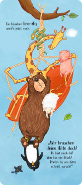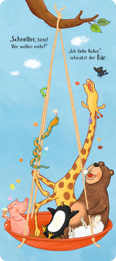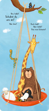 Bär, Giraffe und Pinguin lieben das Schaukeln über alles. Sie können gar nicht genug davon bekommen! Hier können sogar Kinder ab 18 Monaten schon mitmachen: Einfach die Seiten auf und ab bewegen – und die Tiere schwingen himmelhochjauchzend in die Luft. Mal schneller, mal langsamer, mal tierisch verknotet. Ob sie sich auch einen Looping trauen? Die lustigen Reime verraten es.